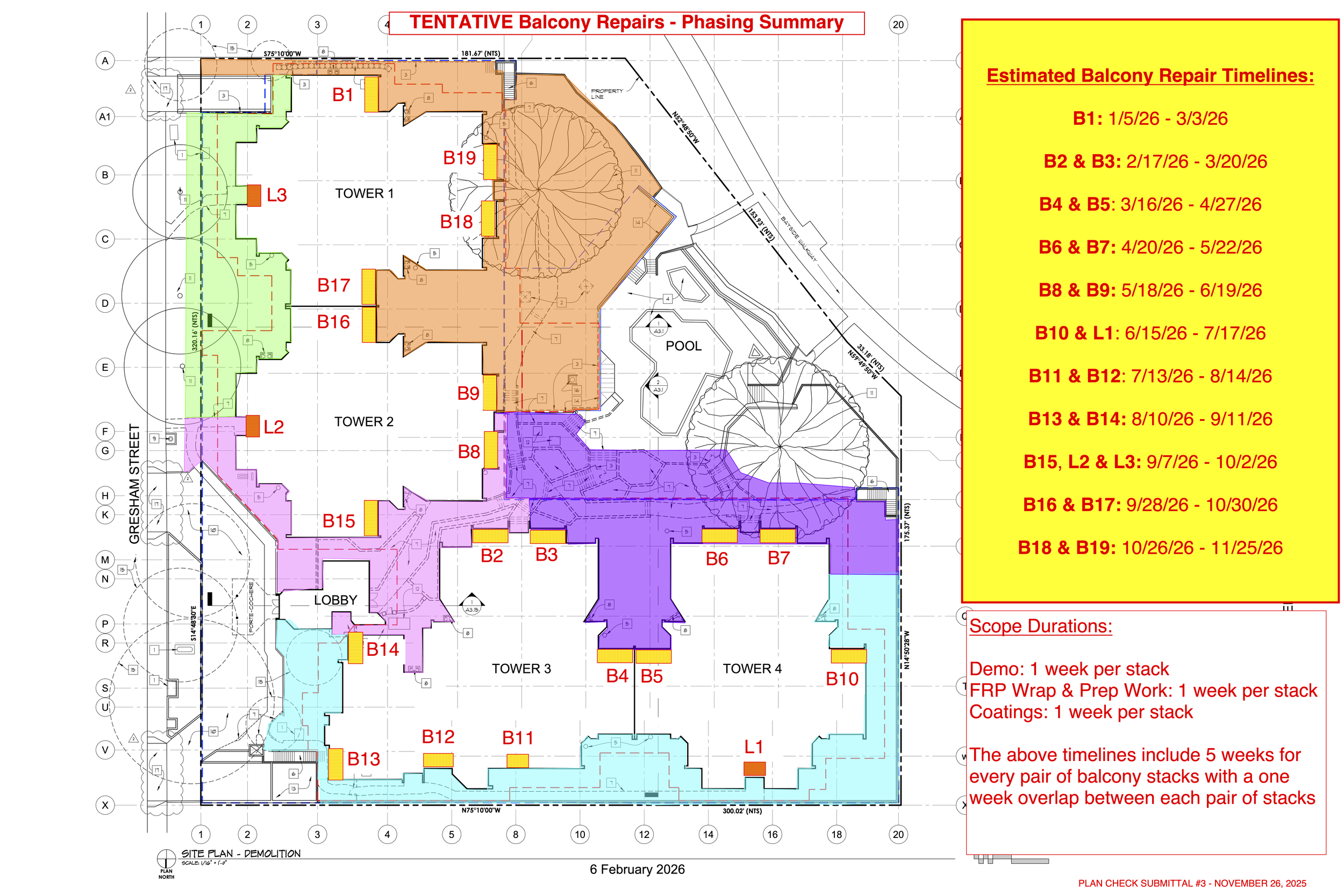 Below is the recently developed schedule of balcony repairs at Bay Scene. These are the repairs that are included in both the 2023 and 2026 special assessments. This is an initial schedule and subject to change, so don’t take the start dates too literally. However, this does provide the sequence of repairs.