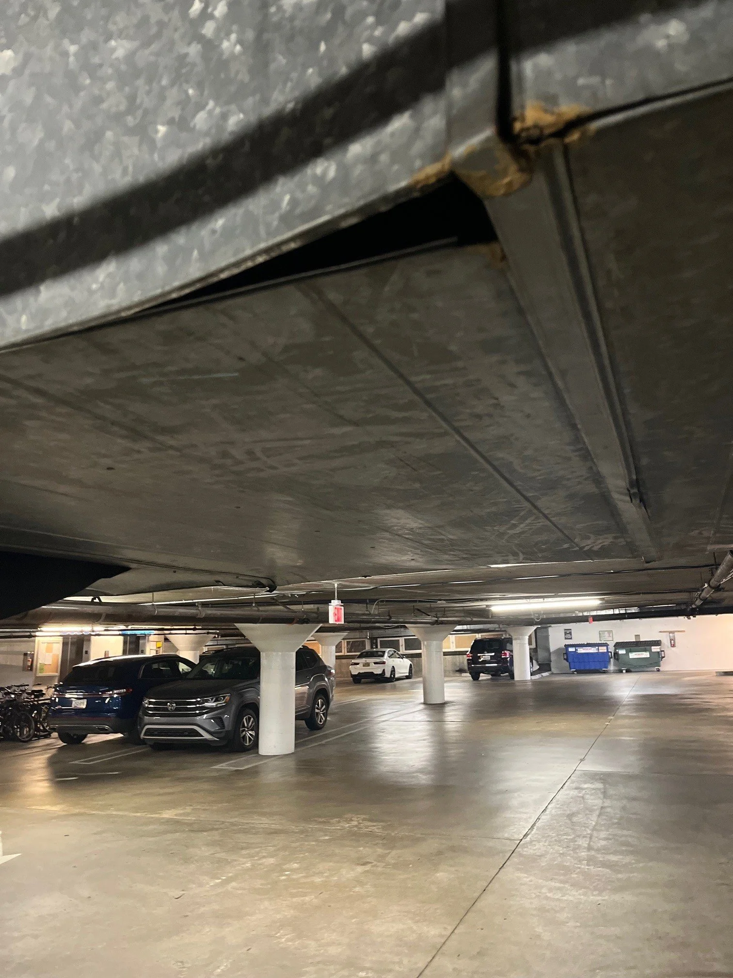 This morning, an incident occurred in the parking garage, where the trash company damaged several areas of the vent system. (ceiling portions)